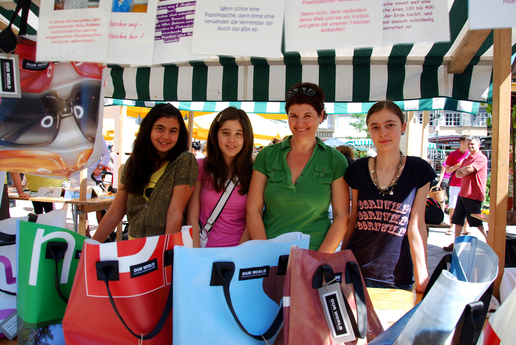 Die Mädels der VMS Lustenauerstrasse hatten gemeinsam mit Elke Riedmann flippige Einkaufstaschen aus Recycling-Transparenten hergestellt.