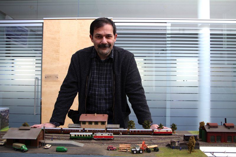 Karlheinz Kindler von der Sparkasse hat große Freude mit der Ausstellung.