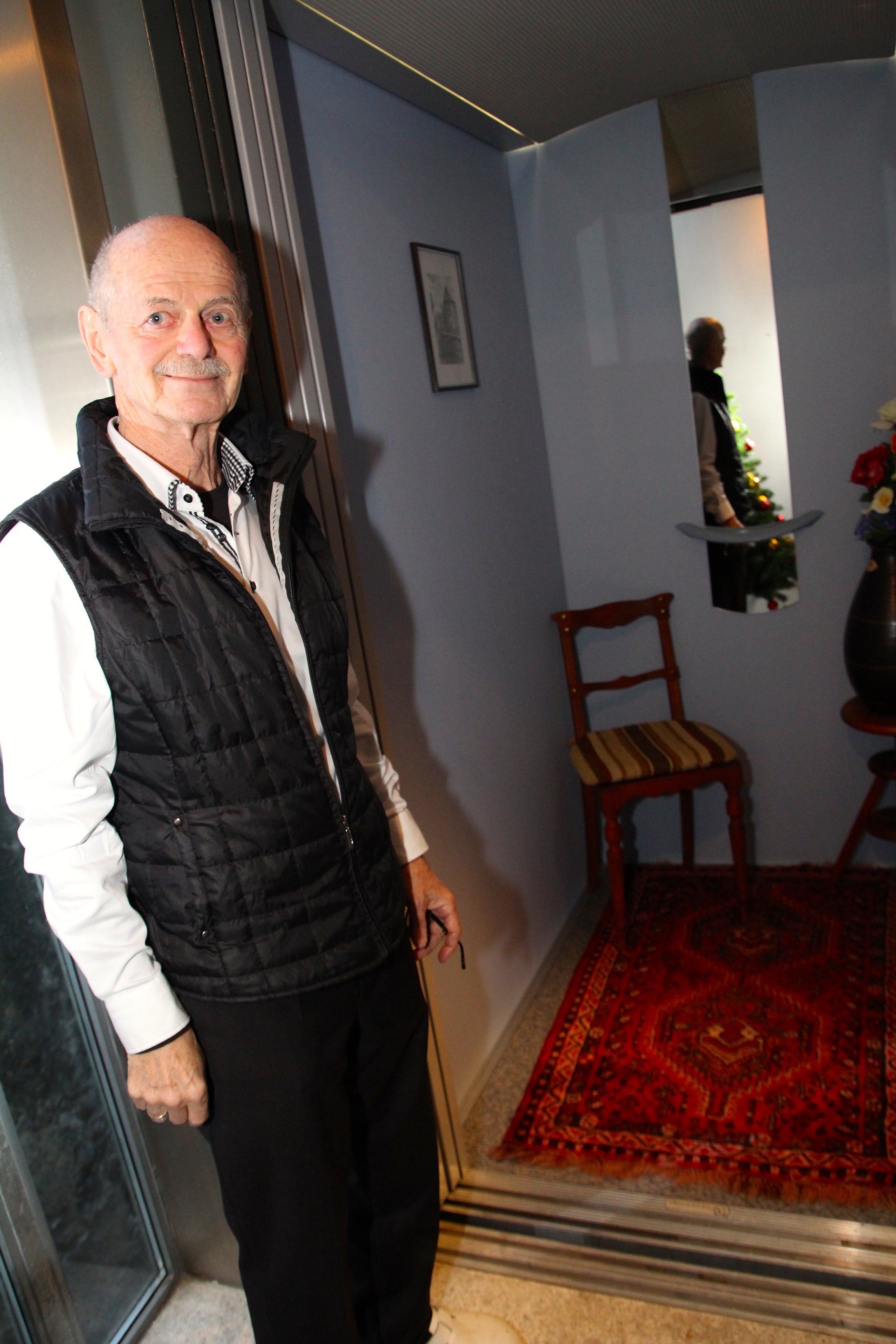 Albert Gohm zeigt stolz den dekorierten Fahrstuhl.