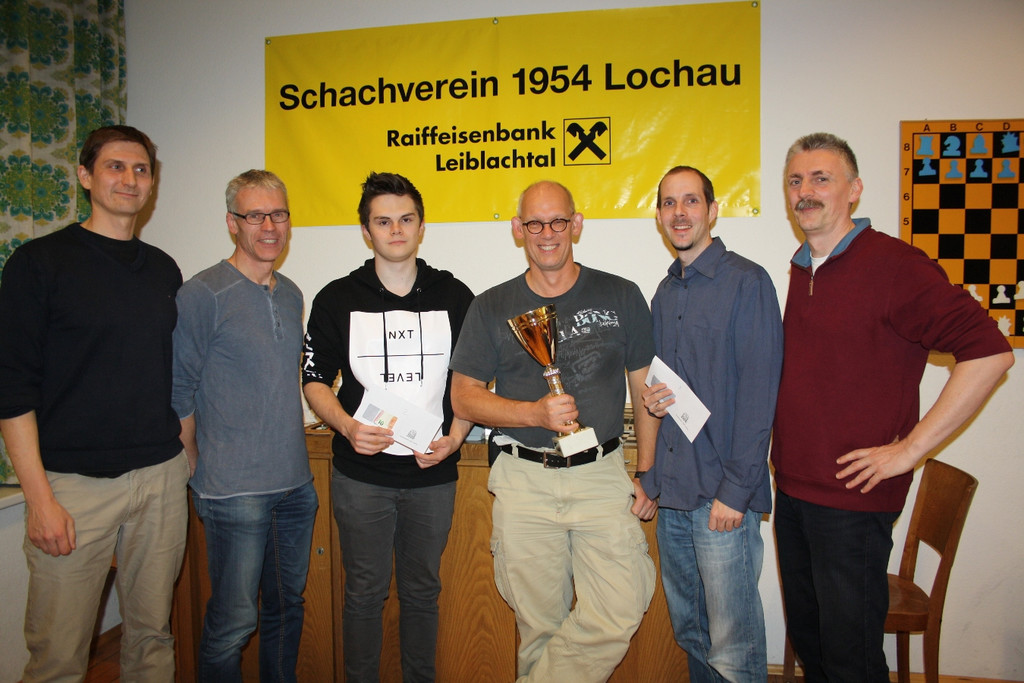 Das Siegerfoto mit Obmann Manfrred Mayr, Reinhard Forster (4. Rang), Fabian Matt (2. Rang), Turniersieger Peter Mittelberger, Peter Ladner (3. Rang) und Alois Planatscher (5. Rang), von links nach rechts.