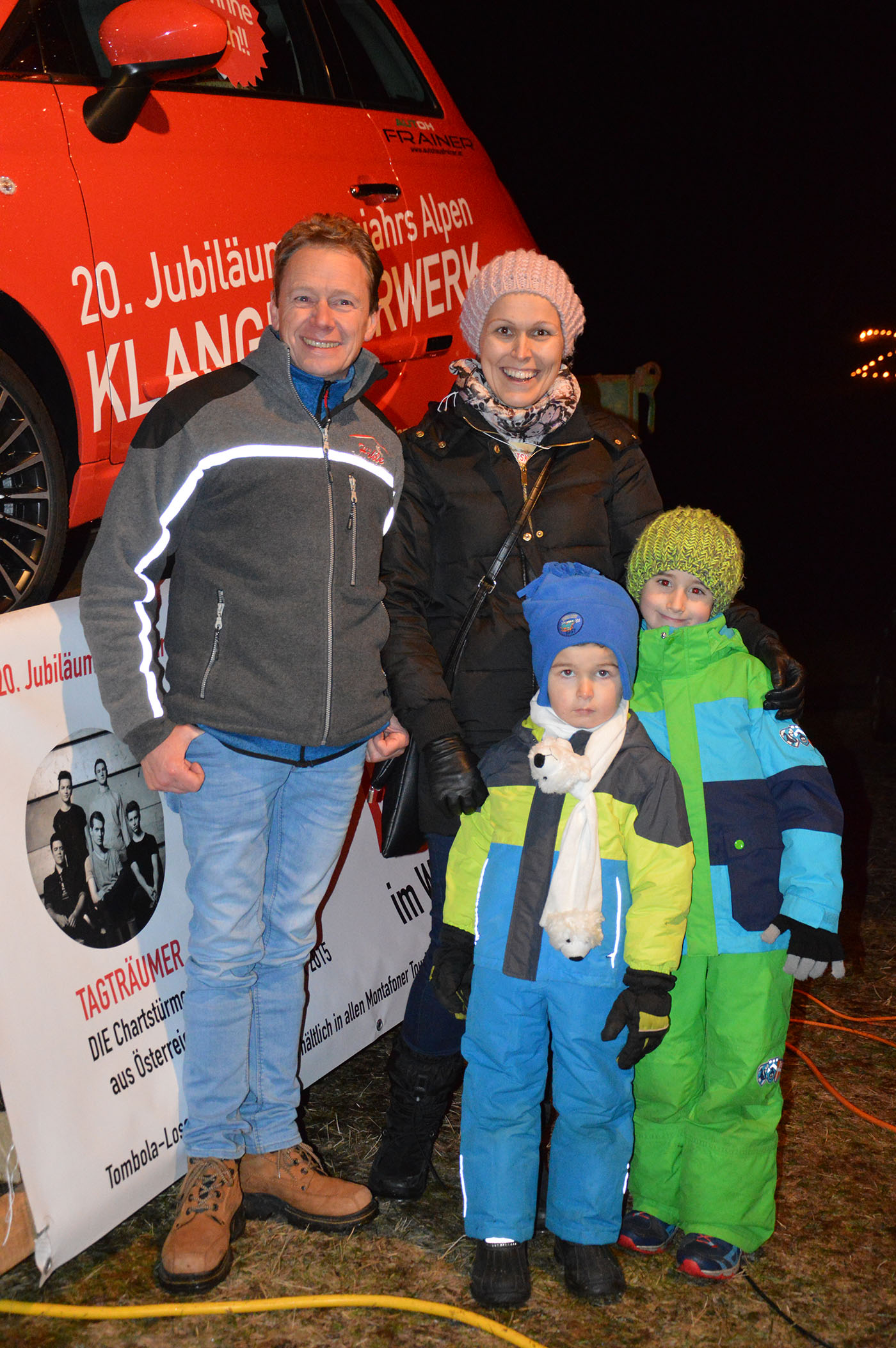 Gerhard Barbisch, Obmann des Wanderstammtisch St. Gallenkirch, zusammen mit der Gewinnerin des Hauptpreises (Auto im Wert von EUR 15.000,00), Sabrina Mattle und deren beiden Kindern - Foto: (c) Gerhard Scopoli - St. Gallenkirch, 1. Jänner 2016