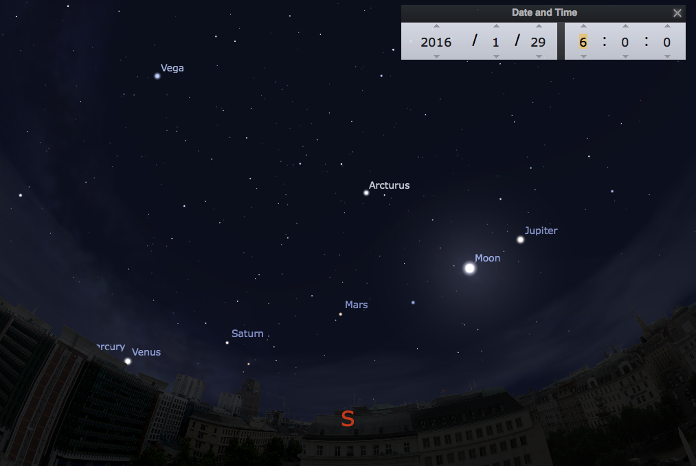 29.1. um 6:00 Uhr, es ist noch finster, daher gute Sicht auf die Planeten und den Mond, aber Merkur noch sehr nahe dem Horizont und wohl von Häusern verdeckt