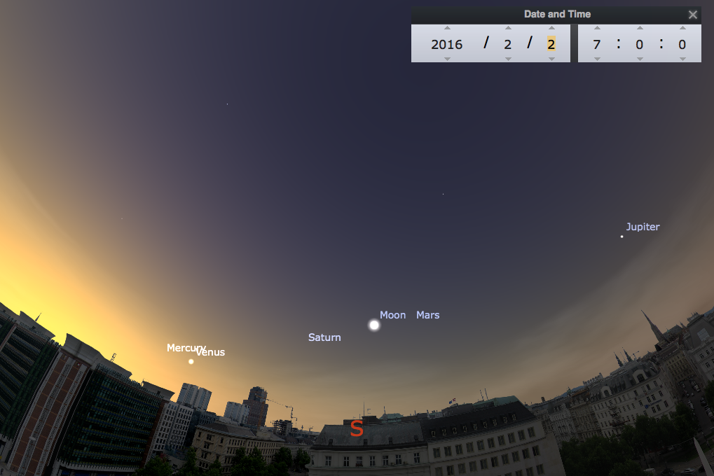 ) 2.2. um 7:00 Uhr, hier erkennt man, dass der Mond am Himmel in den paar Tagen deutlich seine Position verändert hat. Er wandert ja in einem Monat um die Erde und bewegt sich daher flott am Himmel.