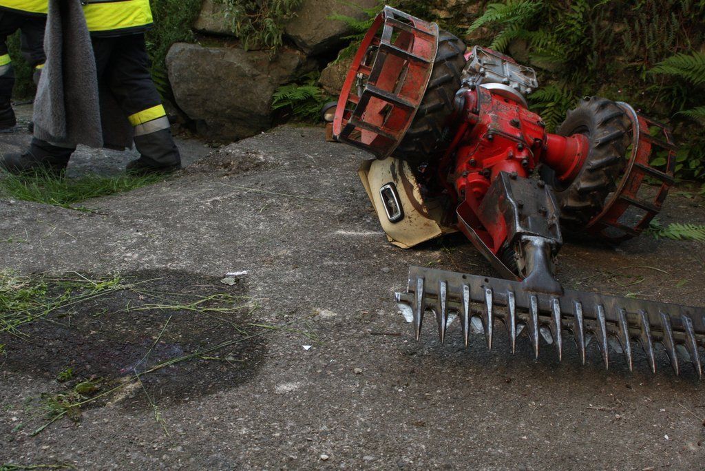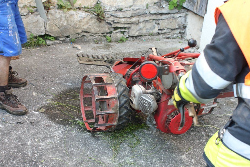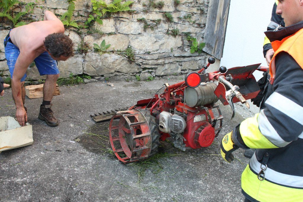 Mit Mähmaschine in Oberschenkel geschnitten