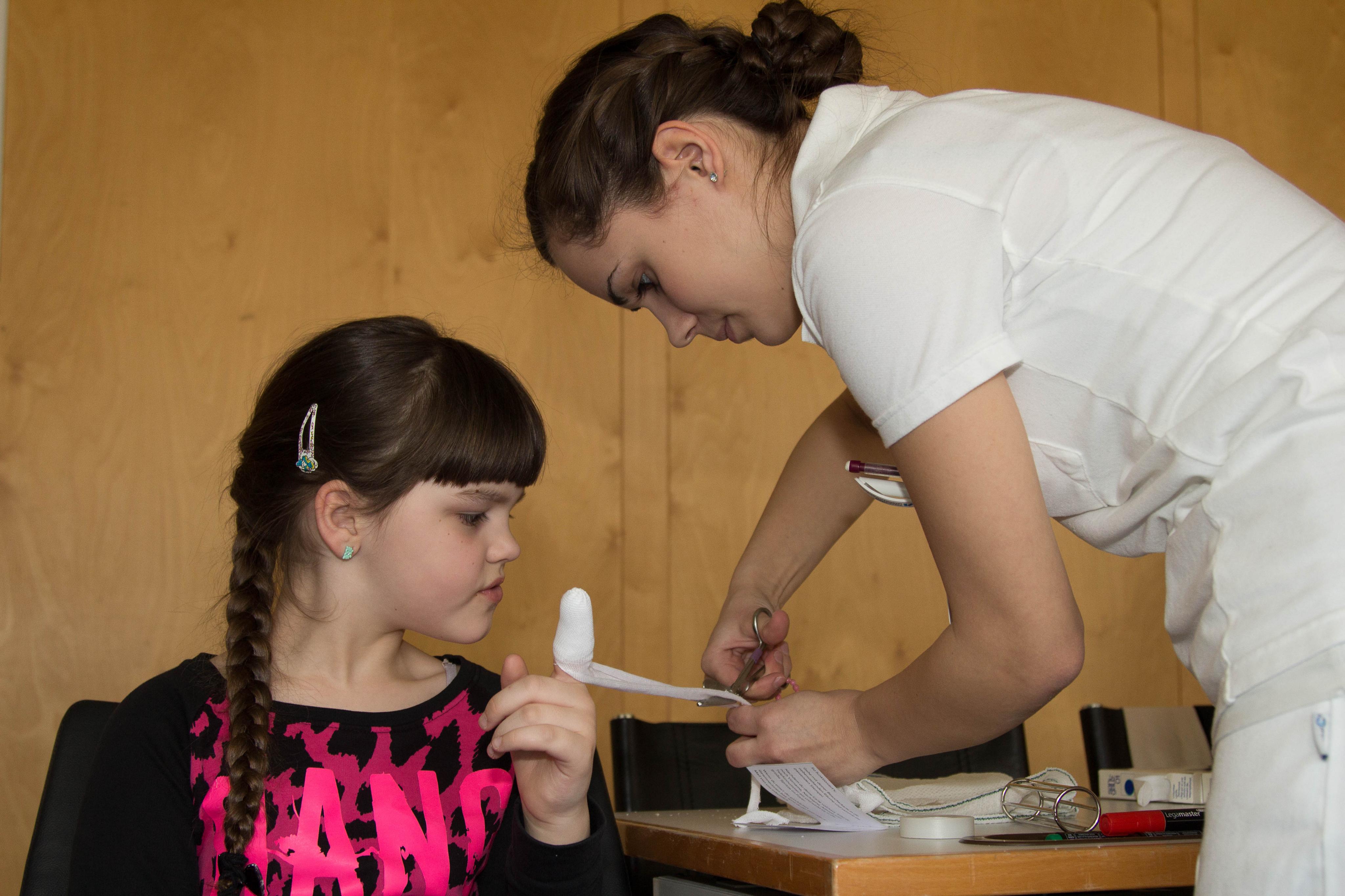 Die junge Besucherin beobachtet ganz genau, wie der Verband angelegt wird.