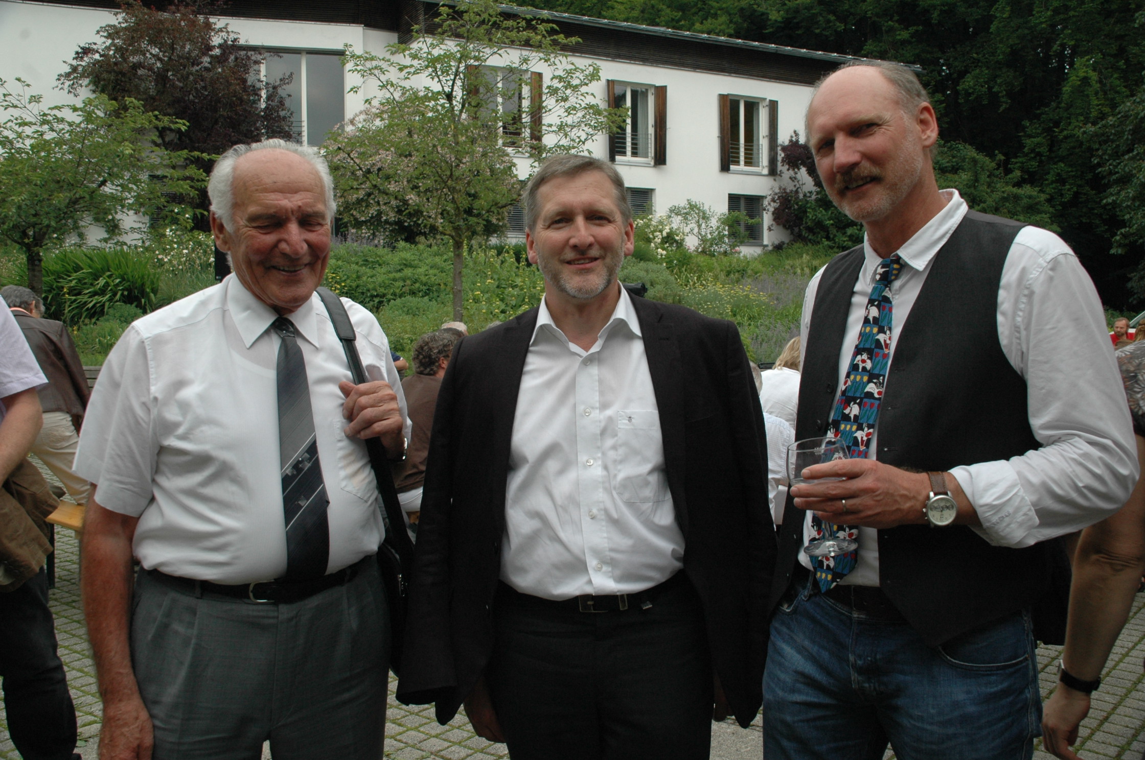 August Christa (ehemaliger Leiter), Pfr. Edwin Matt (Andelsbuch) & Karl Studer im Gespräch