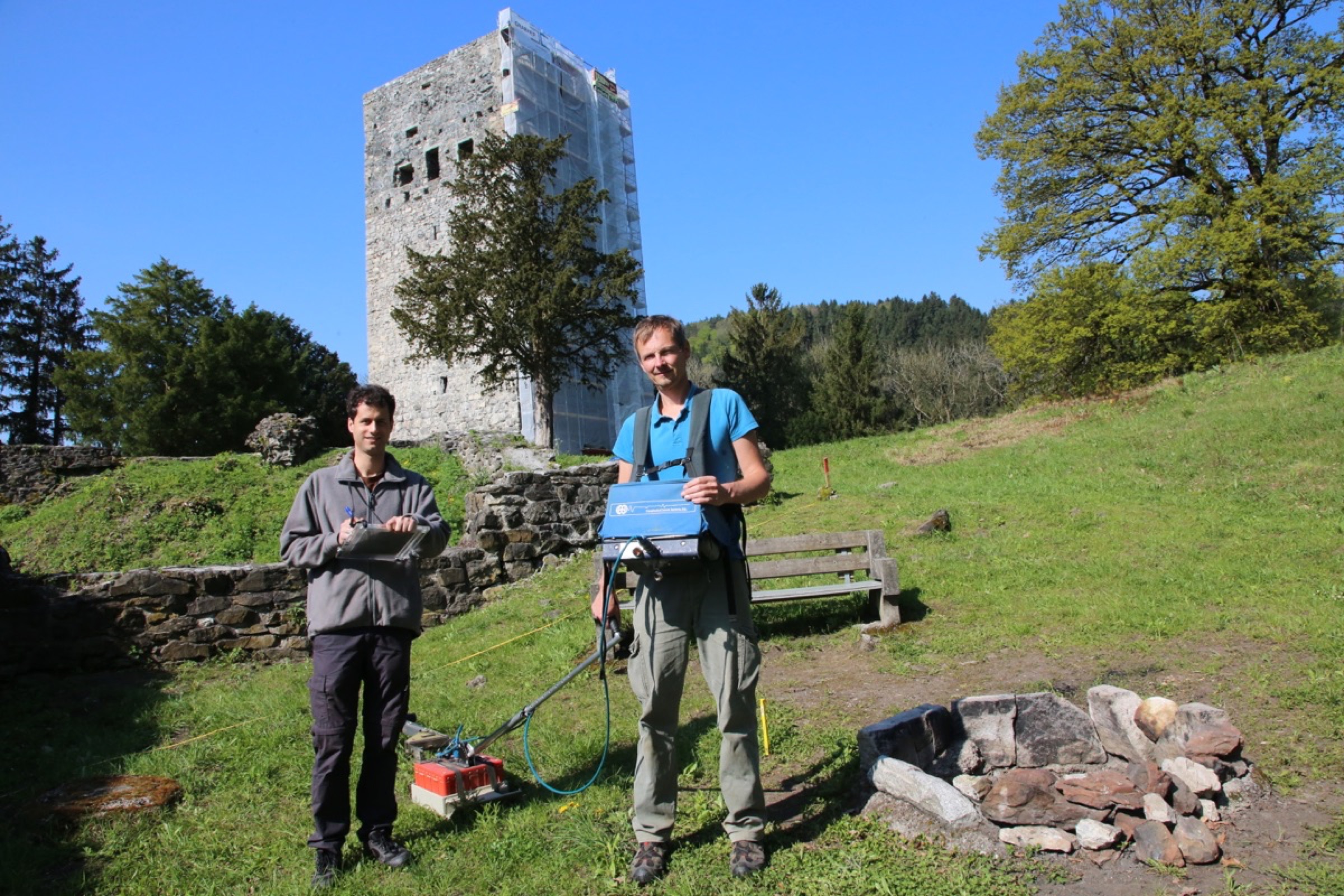 Torsten Riese von der Firma PZP und Andreas Picker vom Bundedenkmalamt untersuchten mittels Bodenradar das Burggelände.