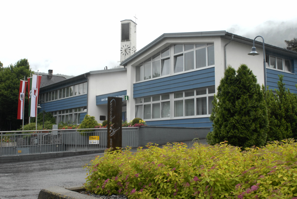 Gemeindeamt Vandans mit neuer Pfarrkirche im Hintergrund, 18. Juni 2010. (Foto: Gerhard Scopoli)