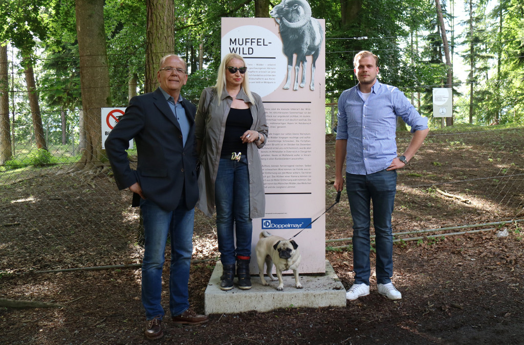 Peter Stadlmüller mit Gattin Antje und Sohn Oliver und Hund Franky sind die Paten vom Mufflon Widder „Leonhard“.