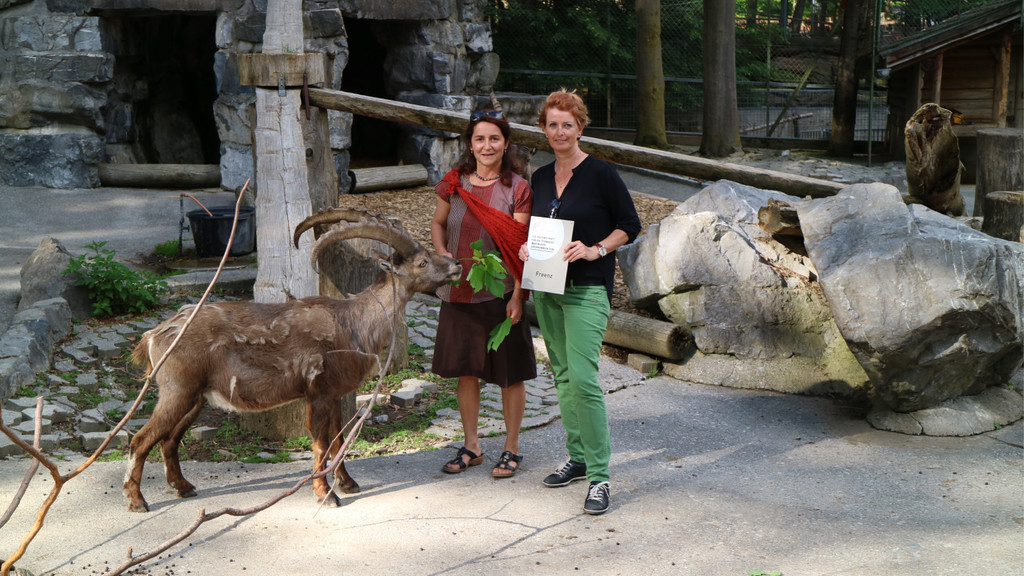 Tierpflegerin Sabine Matt-Schönwetter und Angelika Anderele übernahmen die Patenschaft für die Steingeiß „IBEX“.