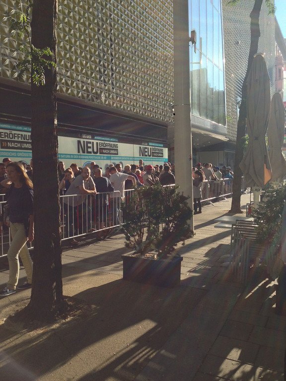 Schlangestehen bei Sonnenaufgang vorm neuen Saturn auf der Mariahilfer Straße