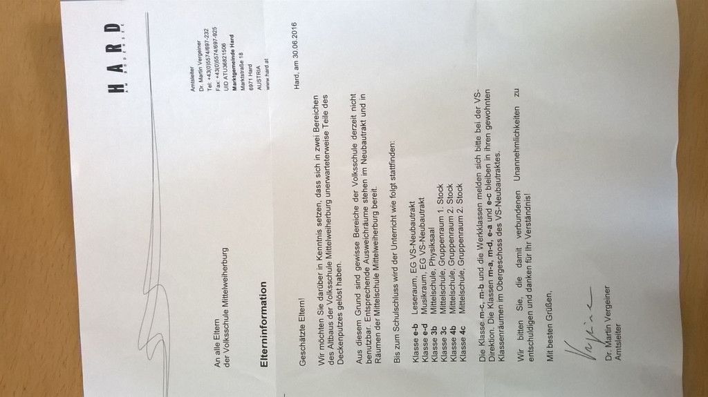 VS Mittelweiherburg: Verputz fällt von den Decken