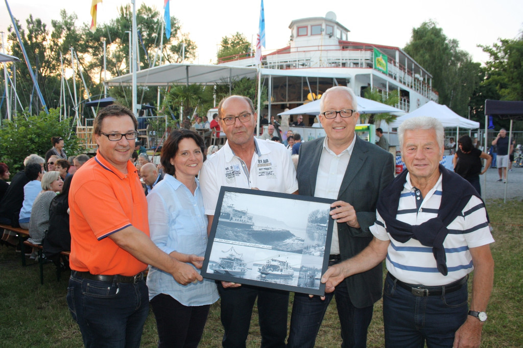 Ein Fest zum Jubiläum: Vizebürgermeister Christophorus Schmid, die engagierten Wirtsleute Yvonne Guschl und Charly Weltle, Bürgermeister Michael Simma und Linus Degasperi vom Lochauer Yachtclub.