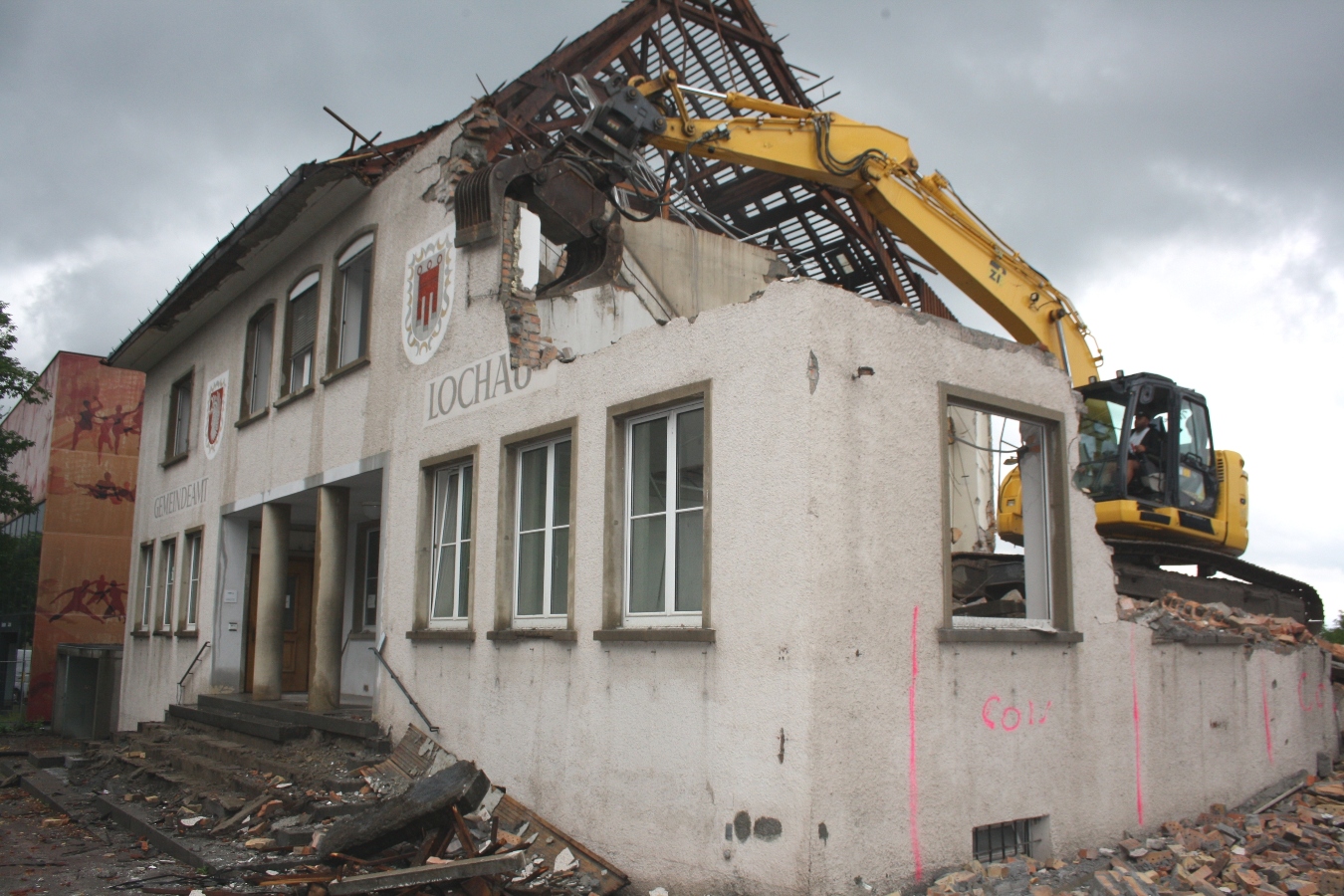 Die Abbrucharbeiten laufen: Das alte Lochauer Gemeindeamt macht Platz für das neue Gemeinschaftshaus.