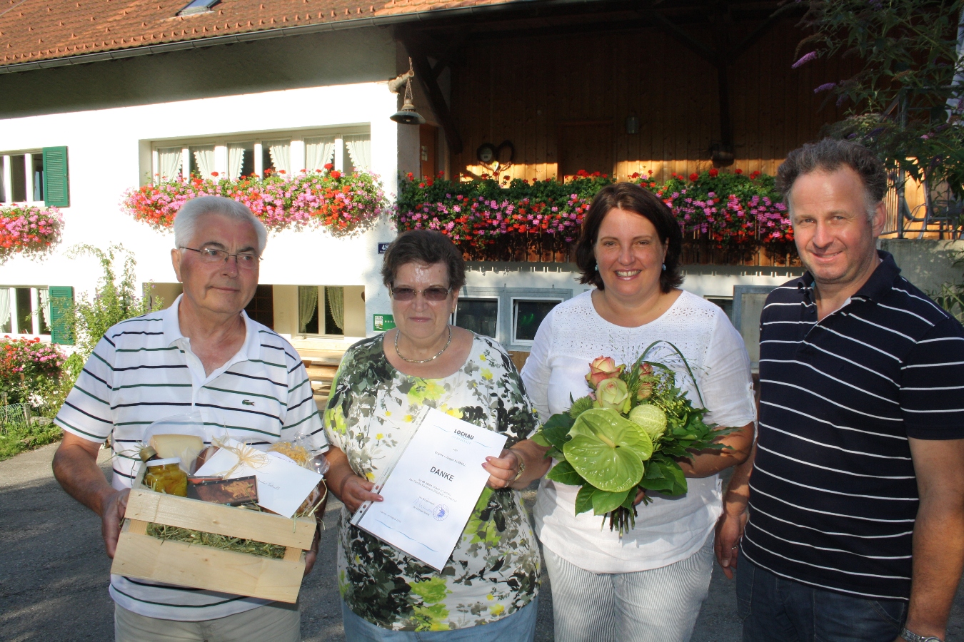 Urlaub auf dem Bauernhof der Familie Kaufmann in Lochau am Bodensee: Jürgen und Brigitte Schroll mit Elisabeth und Helmut Kaufmann.