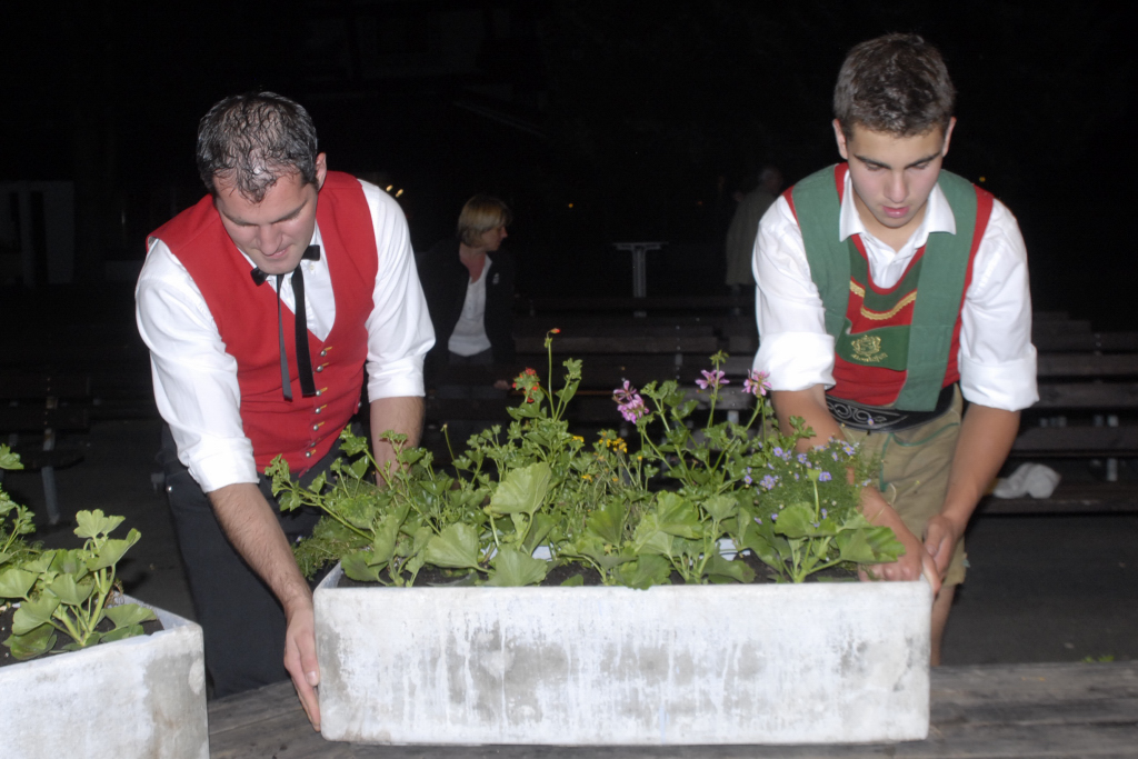 Schuhplattler und die Tanzgruppe der Trachtengruppe Schruns sowie das Publikum beim Musikpavillon in Schruns.