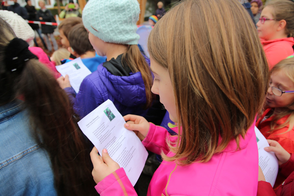 Mit einem eigenen Lied, „Wer hat den Kletterwald gebaut“, gesungen von den 170 SchülerInnen startete das kleine Eröffnungsfest im Pausenhof der VS Nofels.