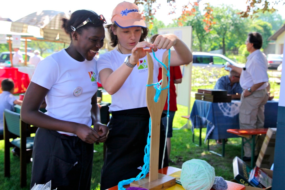 Kinder und Erwachsene bastelten Bänder, mit denen dann am Schluss die Stände verbunden wurden - als Zeichen der Integration
