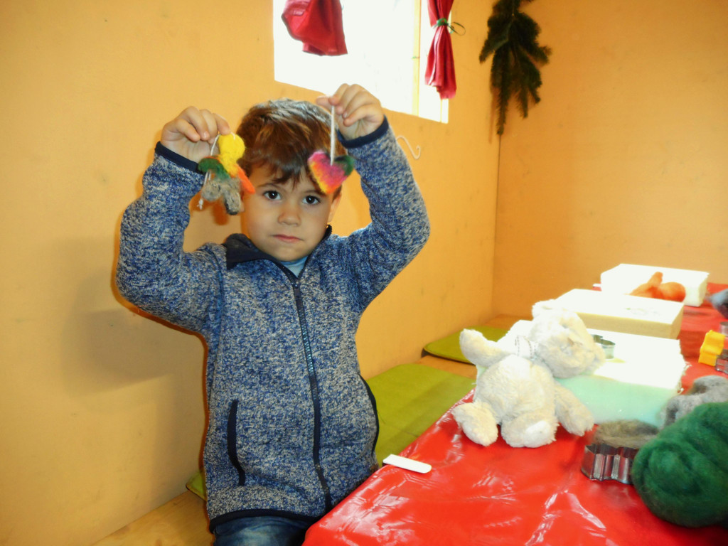Emanuel und sein Bär Emanuel zeigen den fertigen Christbaumschmuck.