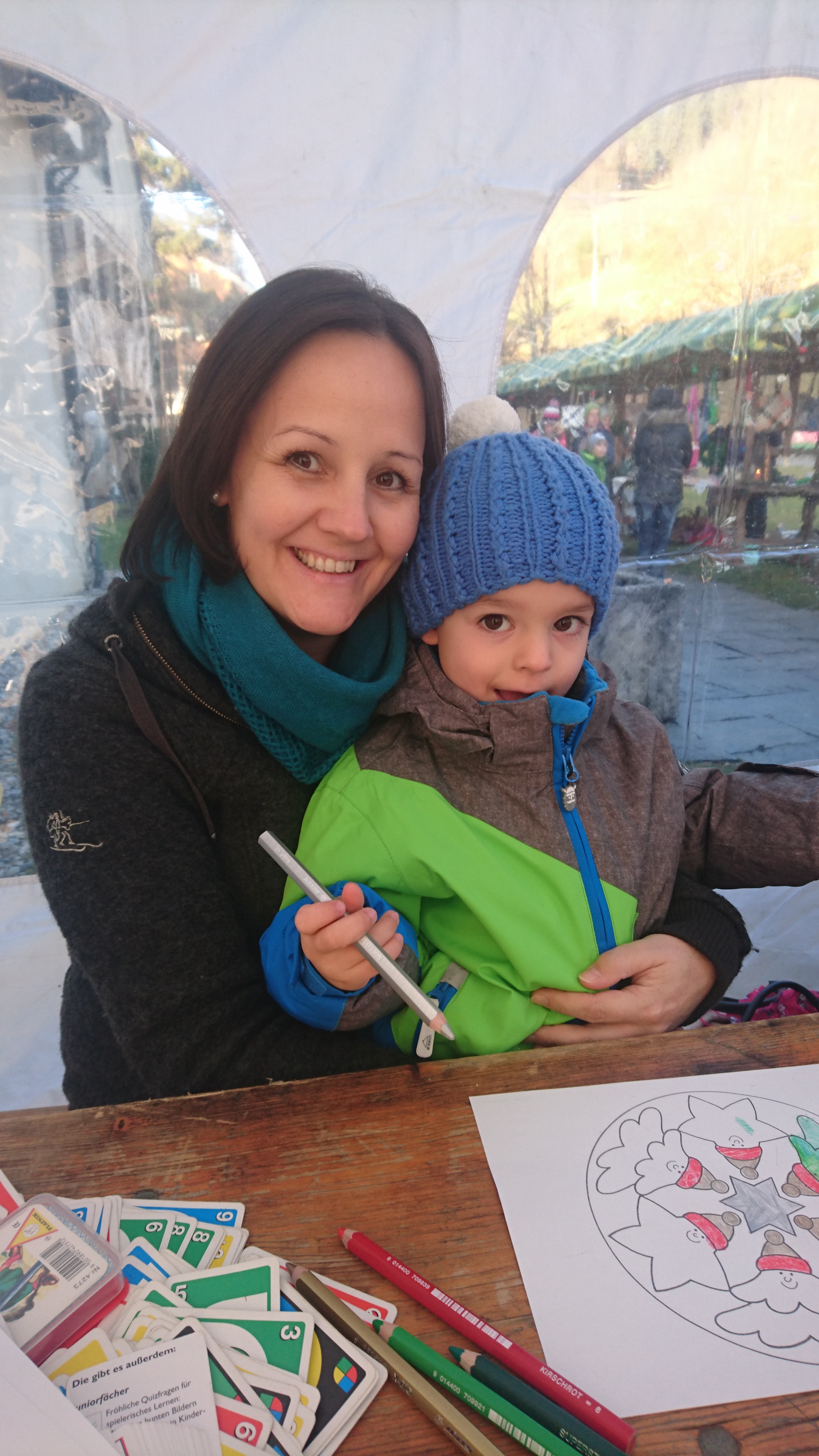 Marina und Luca genießen das Kinderprogramm beim Adventmarkt in Viktorsberg.