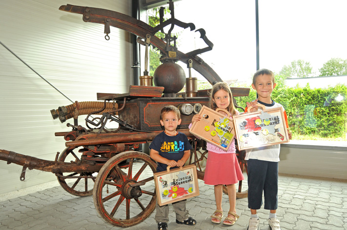 Junge Besucher samt Reisekoffer vor der alten Feuerwehrspritze