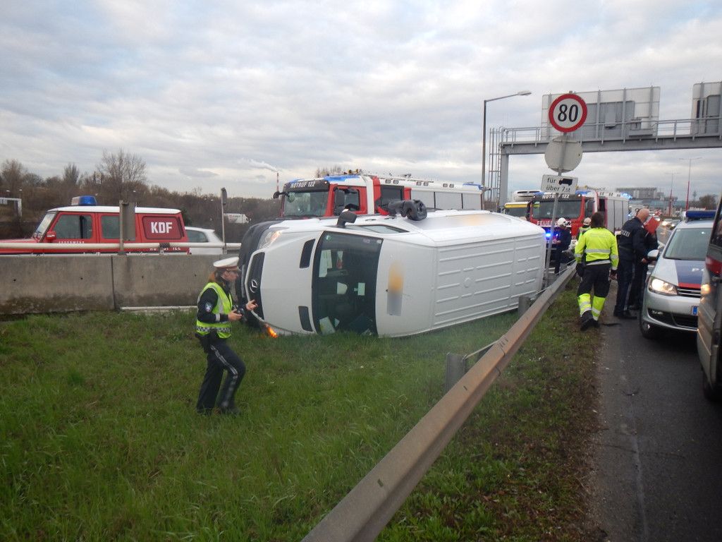 Lieferwagen über Betonleitwand katapultiert: Bilder vom Unfall auf der A23
