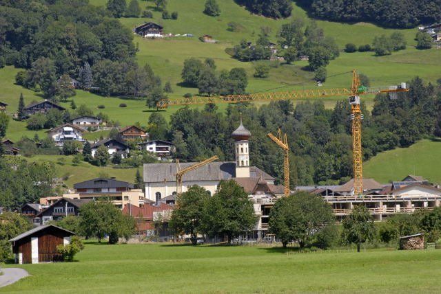 Das Ortszenrum von Schruns (690 m) mit der Pfarrkirche St. Jodok, Kräne bei der Baustelle "Reha-Klinik".