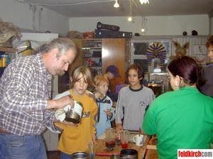 Herbert erklaerte den Kindern die Kunst des Kerzen ziehens.