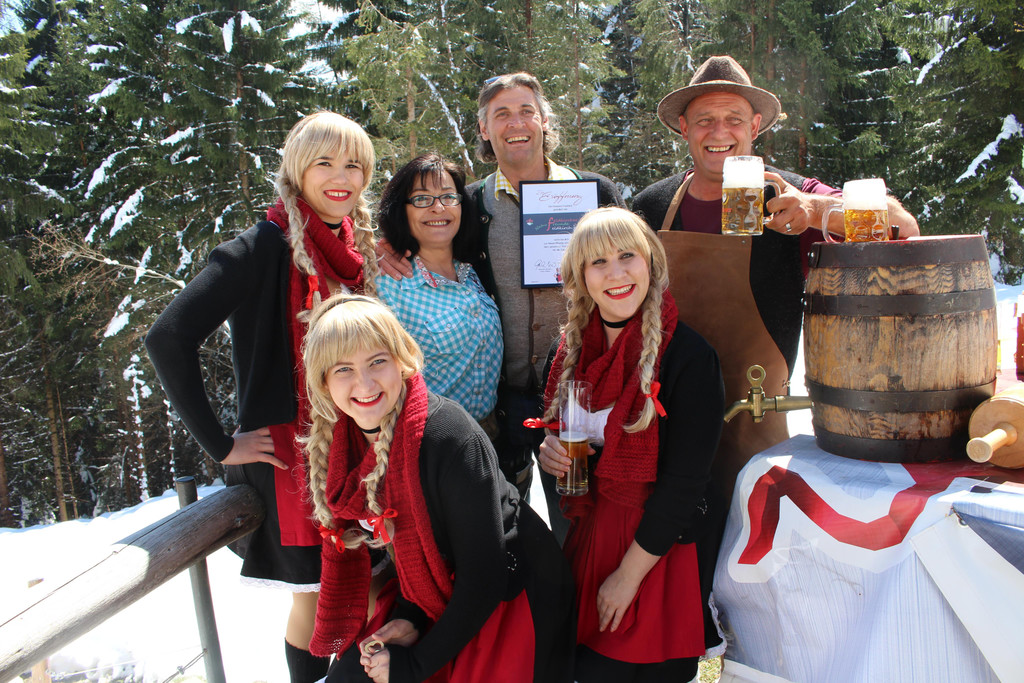 Hüttenpächter Veronika Lins und Jürgen Flatz im Beisein von Sepp Heuberger und den Drei Schwestern.