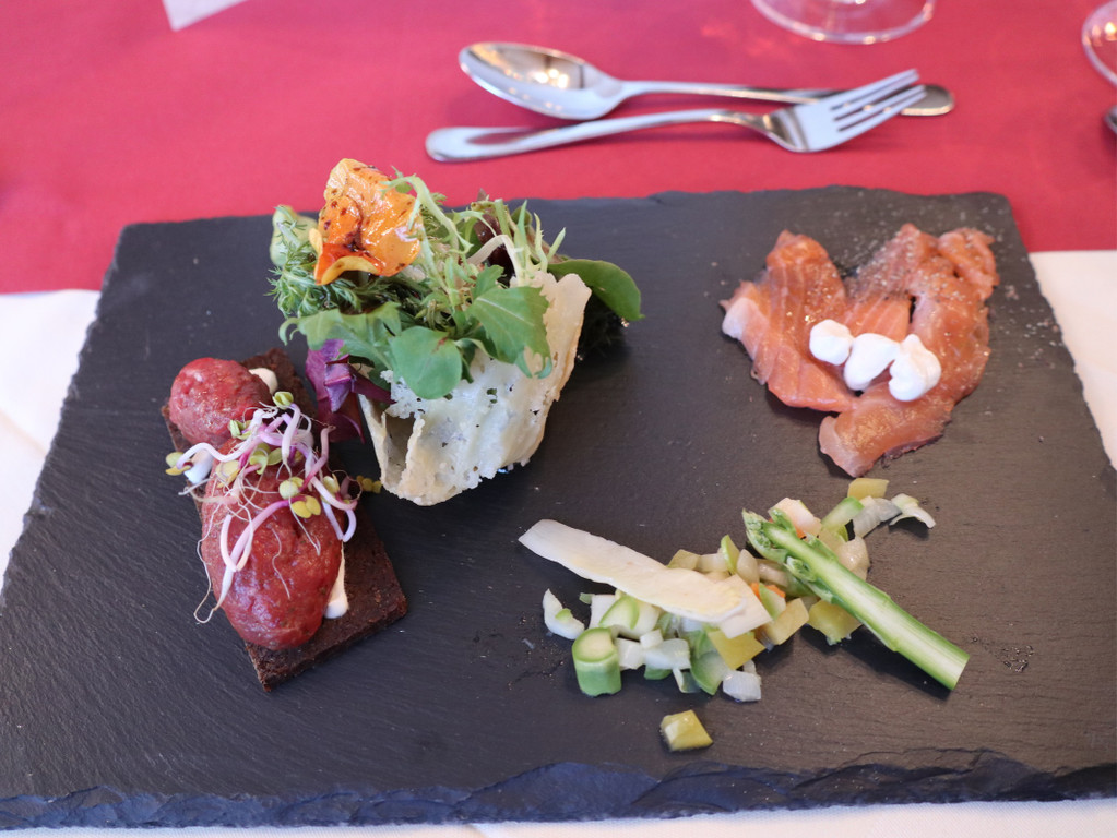 Heimisches Surf and Turf: Süßsaurer Spargelsalat mit marinierter Lachsforelle und Beeftatar vom Ländle-Rind