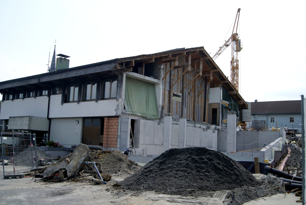 Auftakt: Im Westbereich wurden die Beton – Blumenkästen abgetragen, die Bühne gedreht und die Baugrube für das neue Probelokal im Untergeschoss ausgehoben.