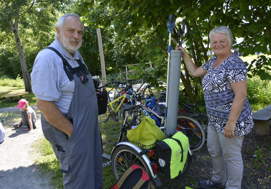 Reinhard Köck mit seinem speziellen Rad und Lehrerin Maria Hämmerle