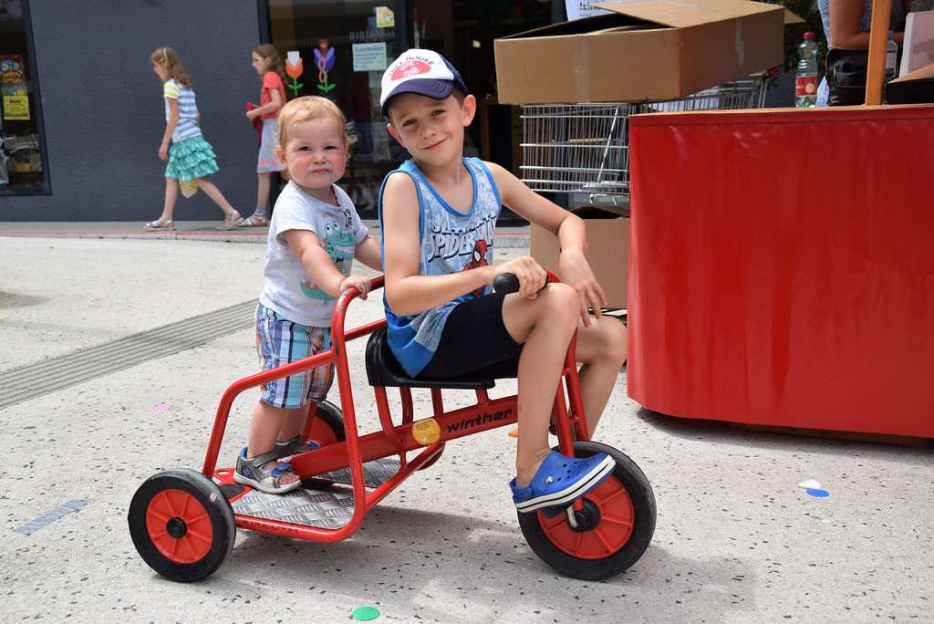 Liam (1 1/2) darf mit seinem Freund Jakob (7) Dreirad fahren.....