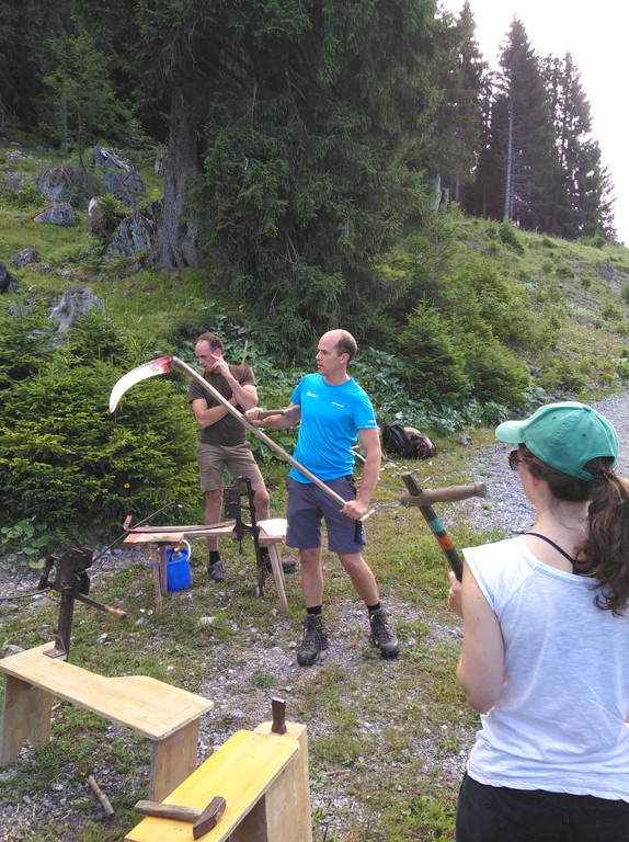 Manuel Metzler und Fabian Winder schulten die Teilnehmerinnen und Teilnehmer im Sensenmähen