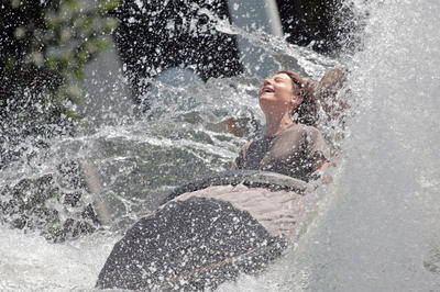 Bei hochsommerlichen Temperaturen verschaffen sich Besucher des Wiener Praters beim sogenannten "Donau Jump" eine Abkühlung.