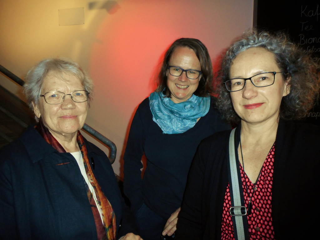 Die Saumarkt-Schreiberin Elisabeth Amann mit Sabine Benzer, Geschäftsführerin des Theaters am Saumarkt, und Ingrid Scharf.