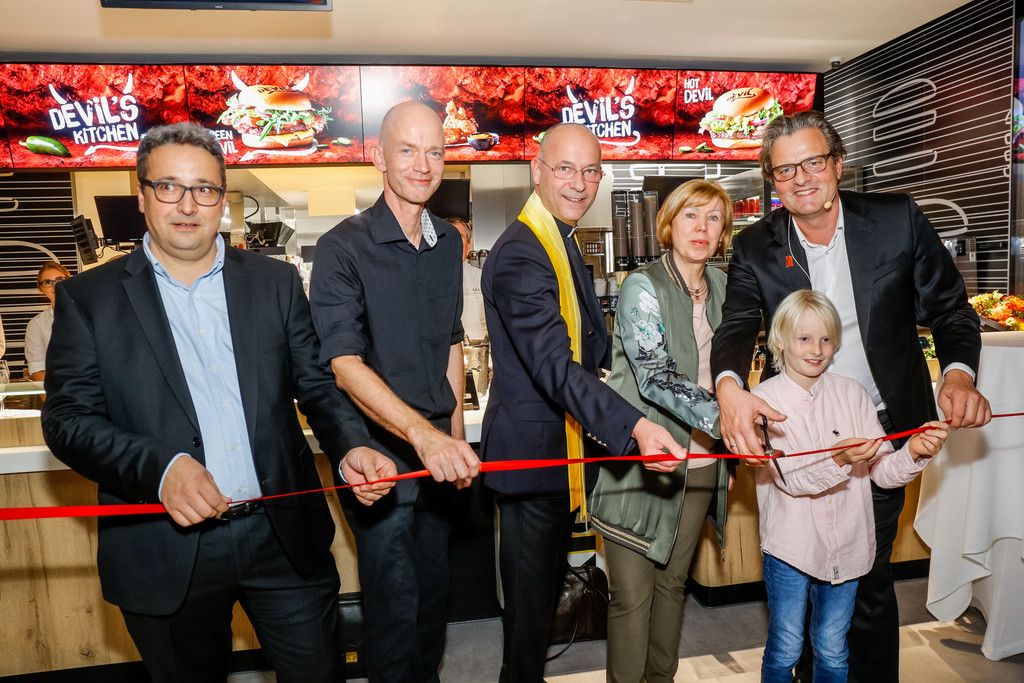 v.l.n.r. Architekt Hansjürgen Frauscher, Restaurantleiter Lars Hoffmann, Dompfarrer Toni Faber, Bezirksvorsteherin Ilse Pferrer, Andreas Schwerla mit seinem Sohn