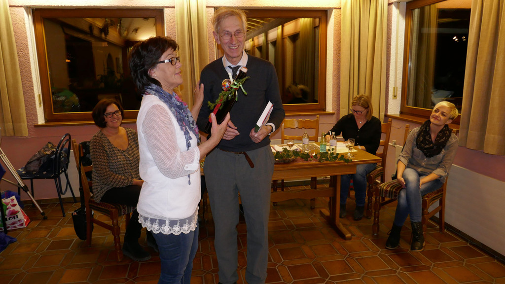 Obfrau Carmen Nachbaur bedankt sich mit Fraxner Kriasiwasser beim Ehrengast Elmar Simma für seinen Beitrag.