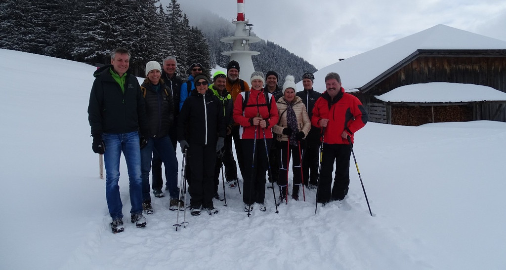 Die Bürgermeister der Dreiklang-Gemeinden Walter Rauch, Anton Mähr und Gerold Mähr mit Wanderern auf dem neuen Winterwanderweg.