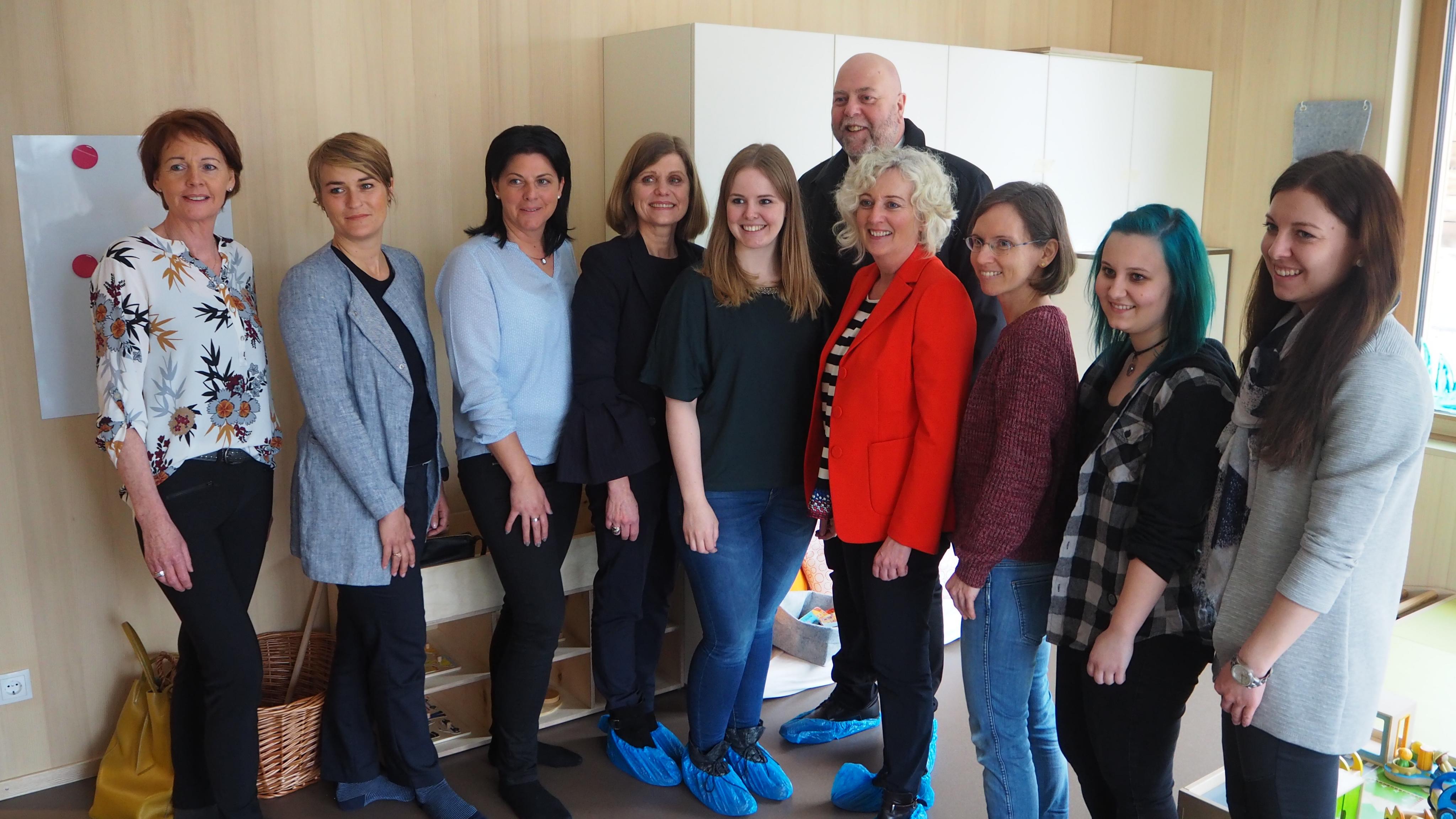Das Team des Zwergengarten mit Leiterin Melanie Huber (Mitte) und Barbara Schöbi-Fink und Katharina Wiesflecker und BM Thomas Pinter (hinten)