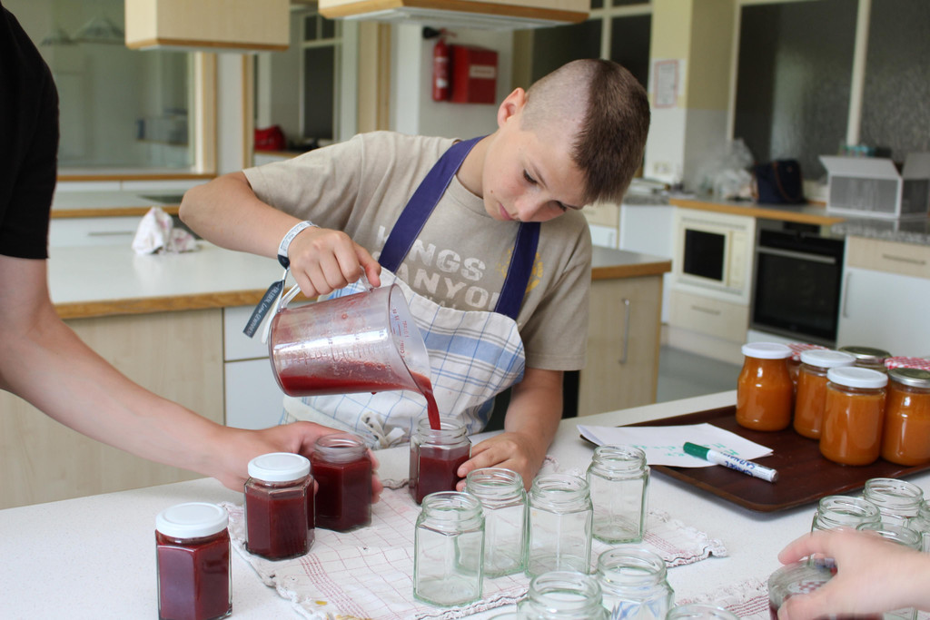 Joshua Nussbaumer füllt die Marmelade vorsichtig in die Gläser