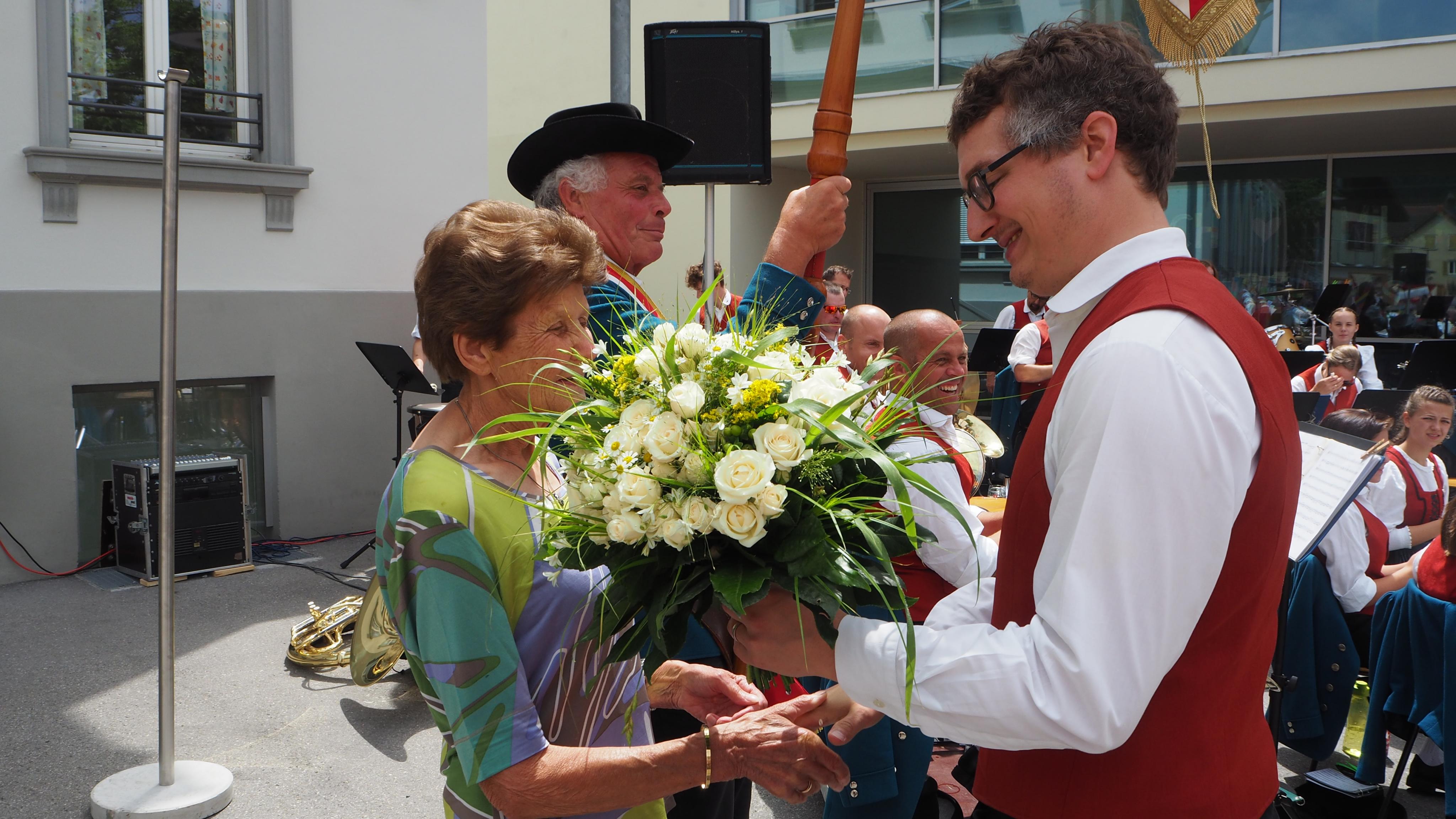 Blumen von Obmann Peter Ender für Fahnenpatin Ruth Spalt