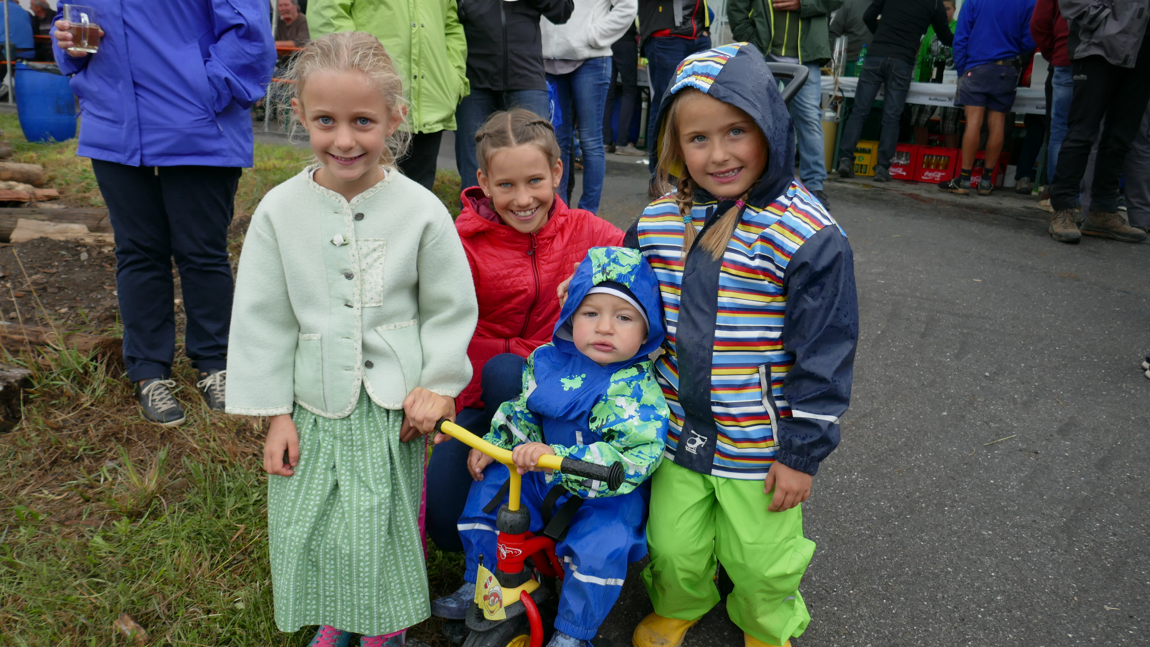 Sofia, Anna-Lena, Adrian und Emma freuen sich über die große Herde an geschmückten Kühen.