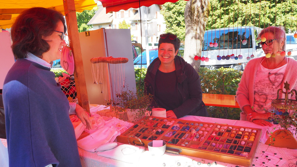 Gudrun Gruber erkundigt sich bei Nicole und Eugenia Beck nach ihren kleinen Kunstwerken