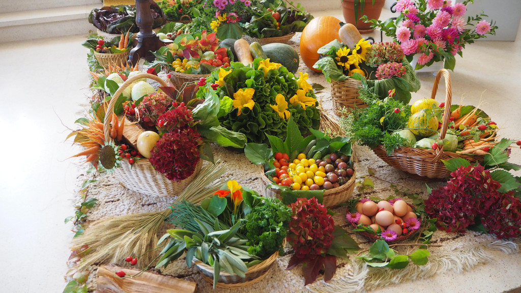 Bunt geschmückte Kirche anläßlich des Erntedankfests