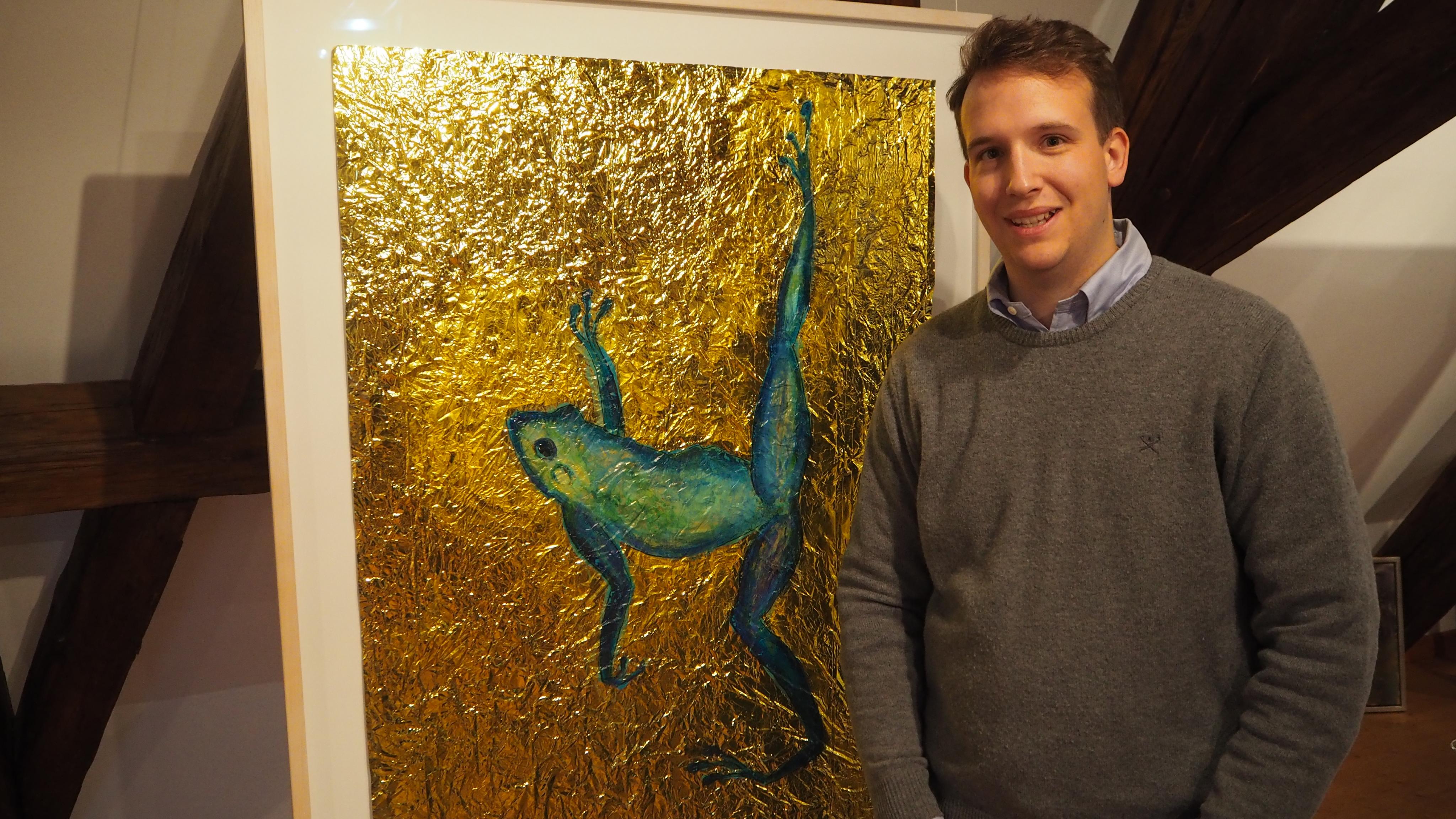 Händler Maximilian Hutz mit einem Frosch gemalt auf einer Rettungsdecke von Barbara Anna Husar
