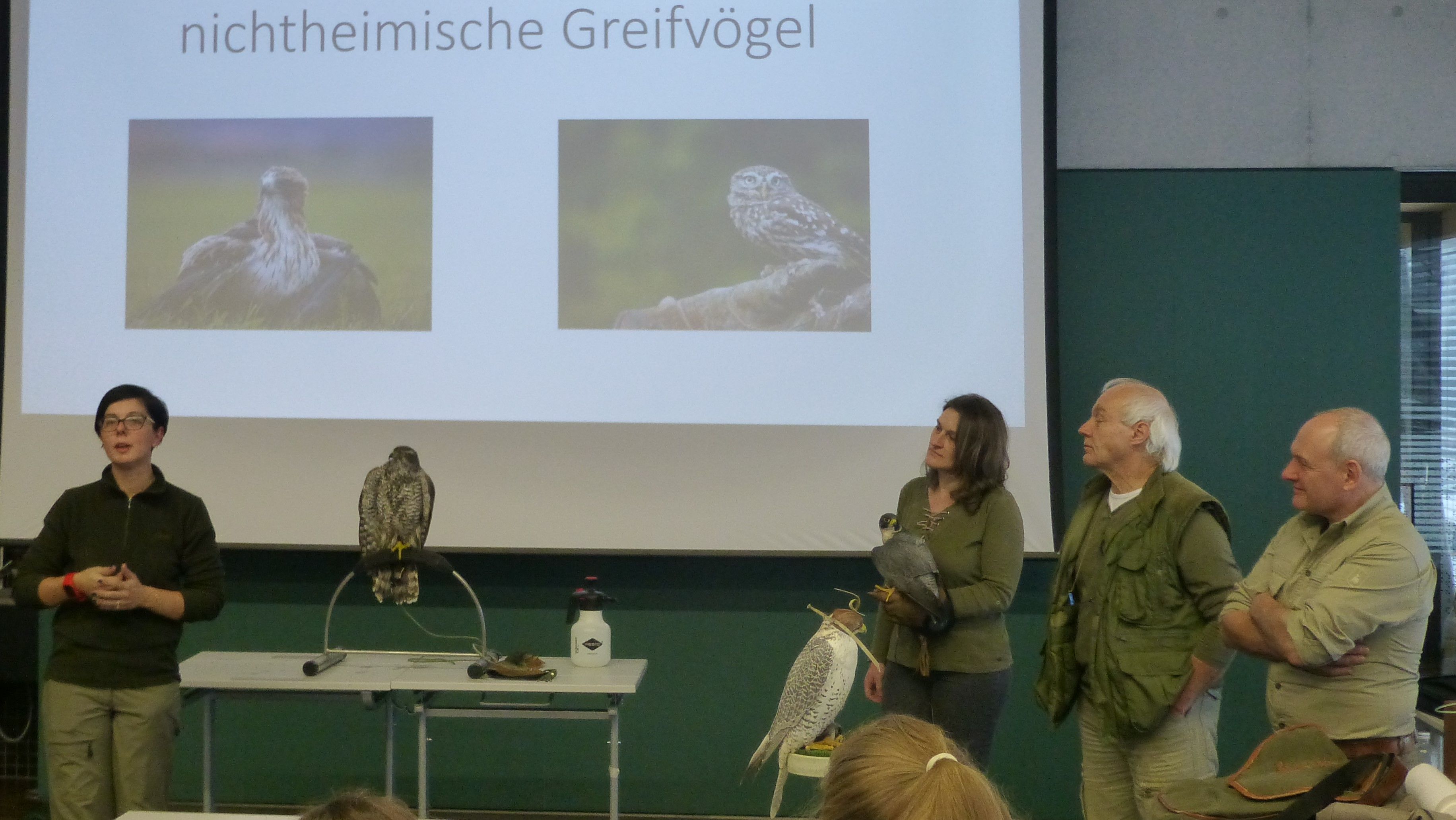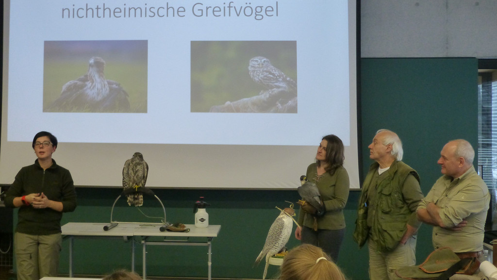 Die vier Falknerinnen und Falkner stellten sich den Fragen der interessierten Schüler.