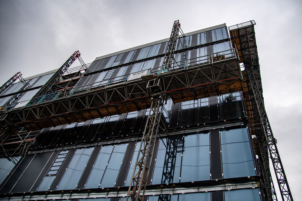 Auf einer Arbeitsplattform trat der Firstbau seine Fahrt in luftige Höhen an.