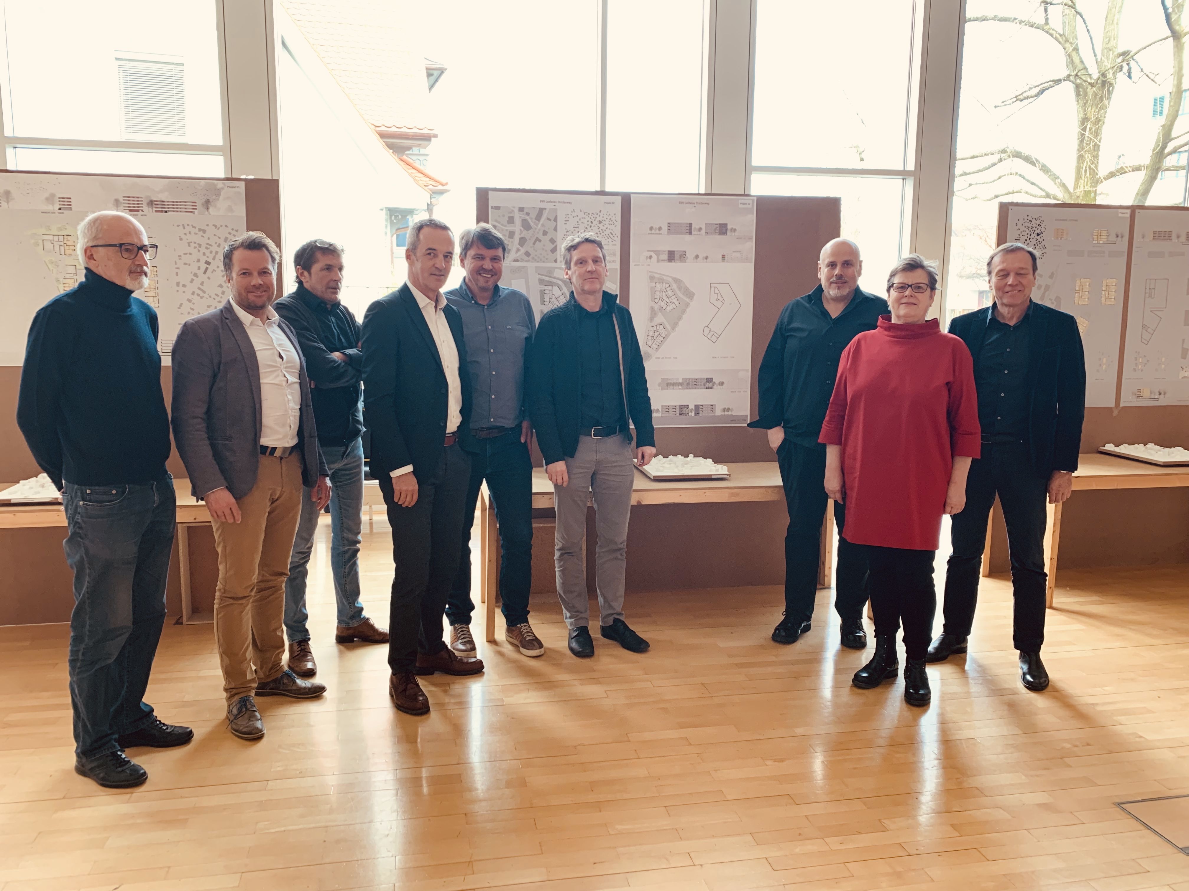 Die Jury mit Architekt Manfred Türtscher, Bernhard Kathrein (Gemeindeplanung), Alexander Pixner (VOGEWOSI), VOGEWOSI-Geschäftsführer Hans-Peter Lorenz, Bürgermeister Kurt Fischer, Architekt Josef Nachbaur-Sturm, Juryvorsitzender Architekt Bernhard Marte, Sozialgemeinderätin Susanne Andexlinger und Architekt Helmut Dietrich.