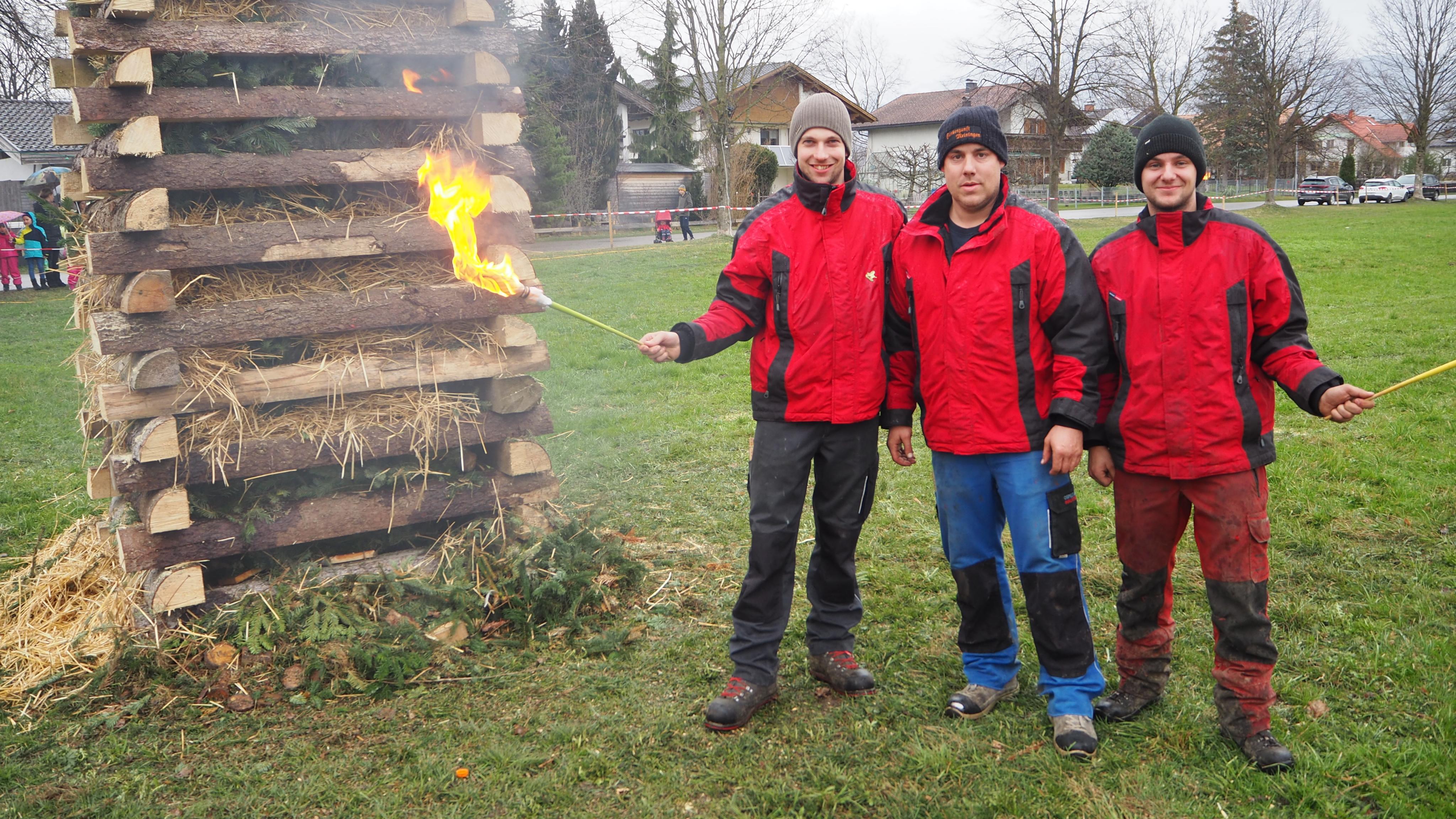 Bereit zum Anzünden: Funkenmeister Günther Gsteu (Mitte) mit Christoph und Matthias